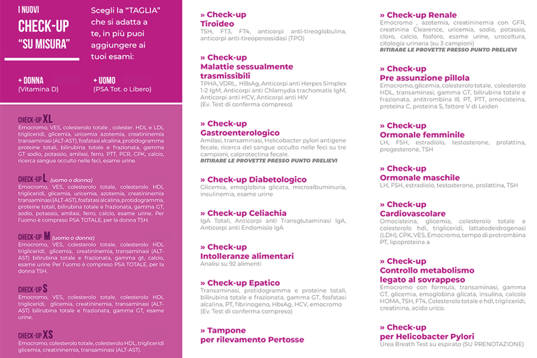 Offriamo sia pacchetti di analisi completi per il controllo della salute (check-up generali e mirati), sia analisi personalizzate prescritte dal medico curante.